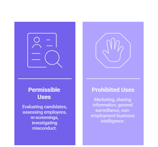 - Employers must verify that their processes account for both the permissible purpose standard and the specific restrictions tied to funding sources or contract obligations.