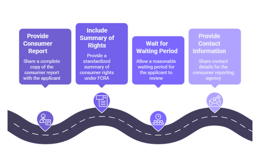 Before taking adverse action based on information in a consumer report, employers must provide the applicant with a pre-adverse action notice that includes a copy of the consumer report and a written summary of rights under FCRA. This notice creates an opportunity for the applicant to review the report, identify errors, and provide context or mitigating information.