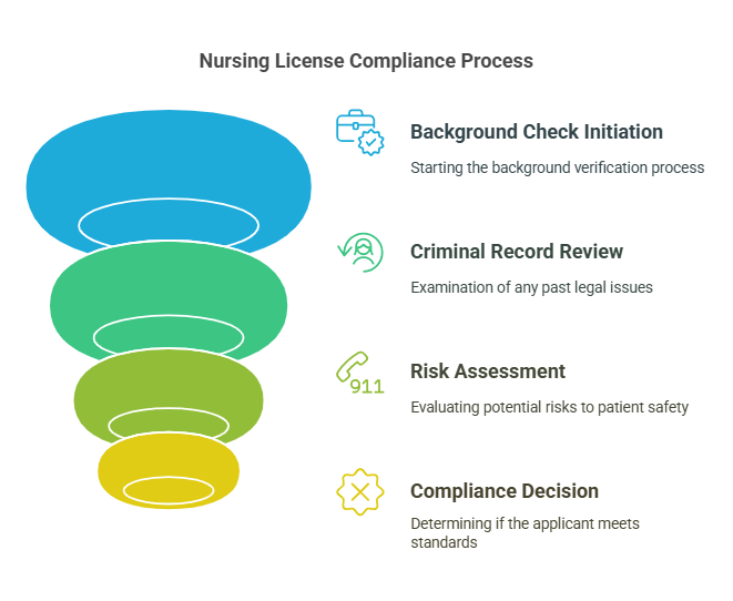 - Key components include reviewing criminal history, fingerprinting, and continuous monitoring to ensure ongoing suitability for practicing nursing.