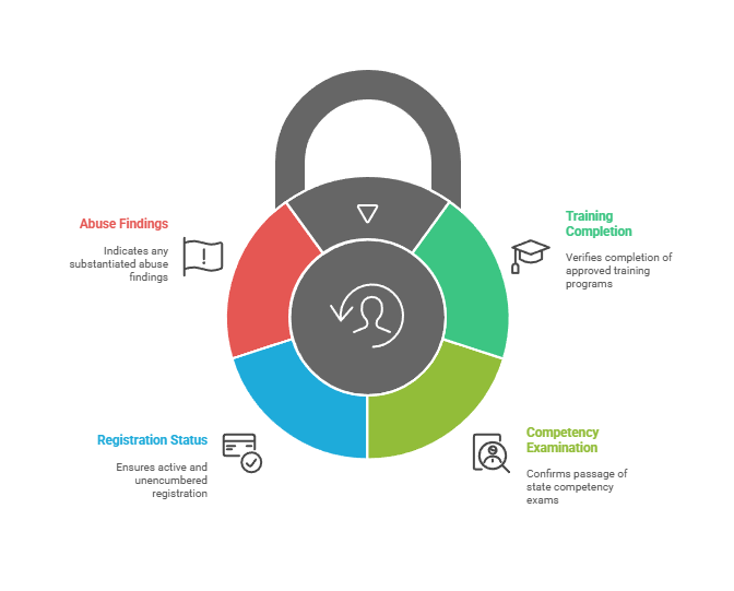 - Abuse findings: Indicates any substantiated findings of abuse, neglect, or misappropriation that would prohibit employment
