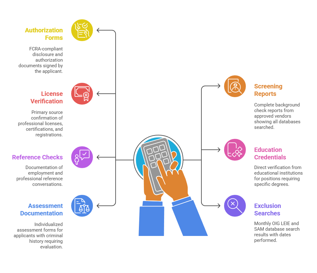 Each employee's personnel file should contain comprehensive documentation of all completed background screening components. Alabama Board of Health surveyors routinely audit personnel files during licensing inspections. They select random samples to verify background check completion. Essential documentation elements include:
