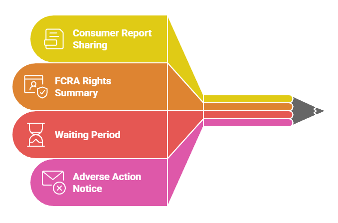 FCRA adverse action requirements mandate specific procedures before denying positions based on background check results. Organizations must provide pre-adverse action notices including copies of the consumer report. They must include summaries of FCRA rights. They must allow reasonable time for dispute or explanation.