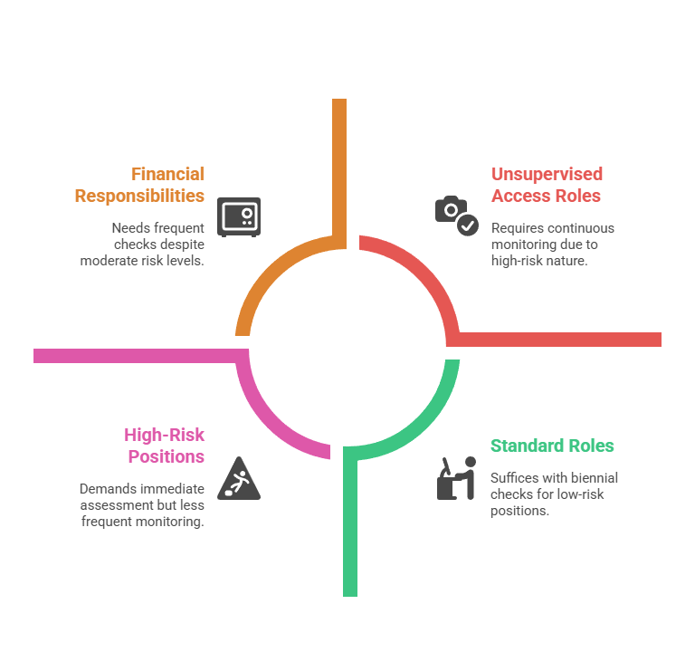 • Monitoring frequency: Annual re-screening for high-risk positions, biennial checks for standard roles, continuous monitoring for those with unsupervised access.