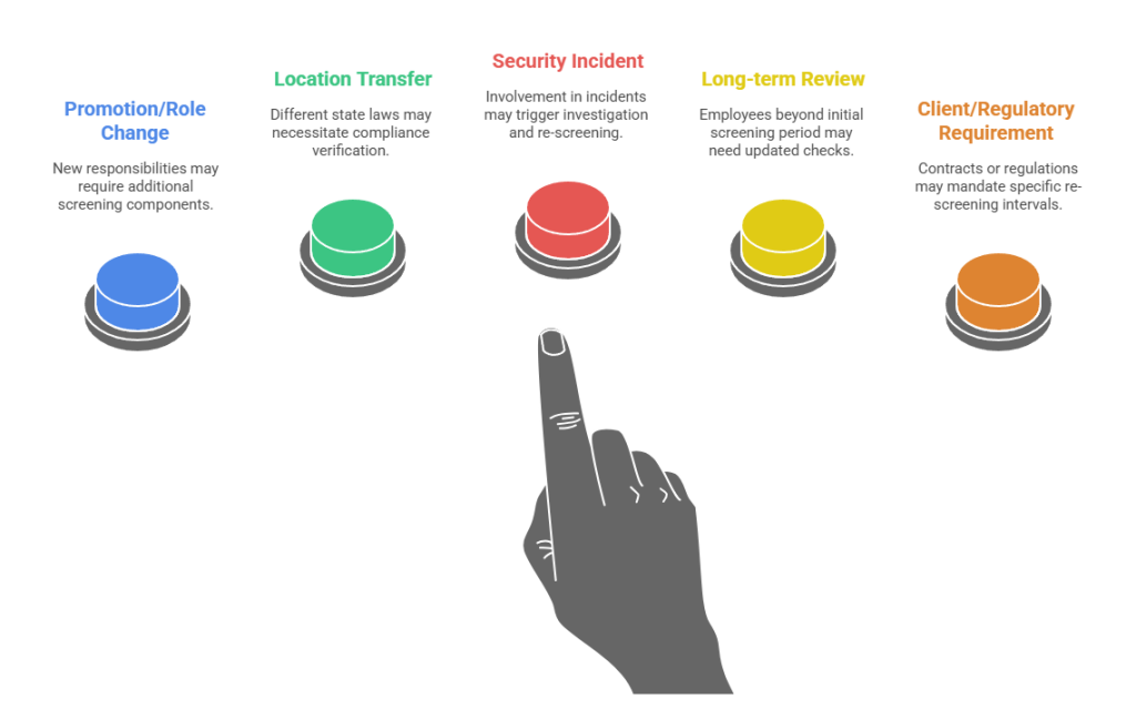 - Re-screening: Specify circumstances triggering re-screening during employment.
