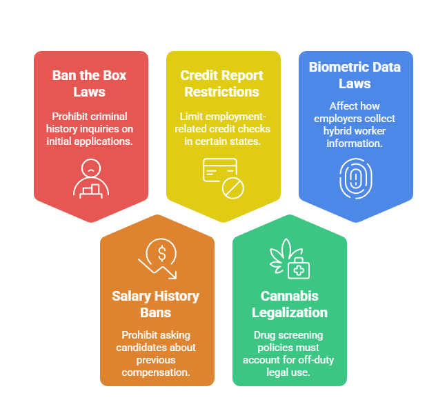 - Multi-state compliance considerations become critical when hybrid employees work across state lines, as background check laws differ substantially by location.