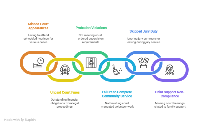 - Missed court appearances: Failing to attend scheduled hearings for traffic, criminal, or civil cases