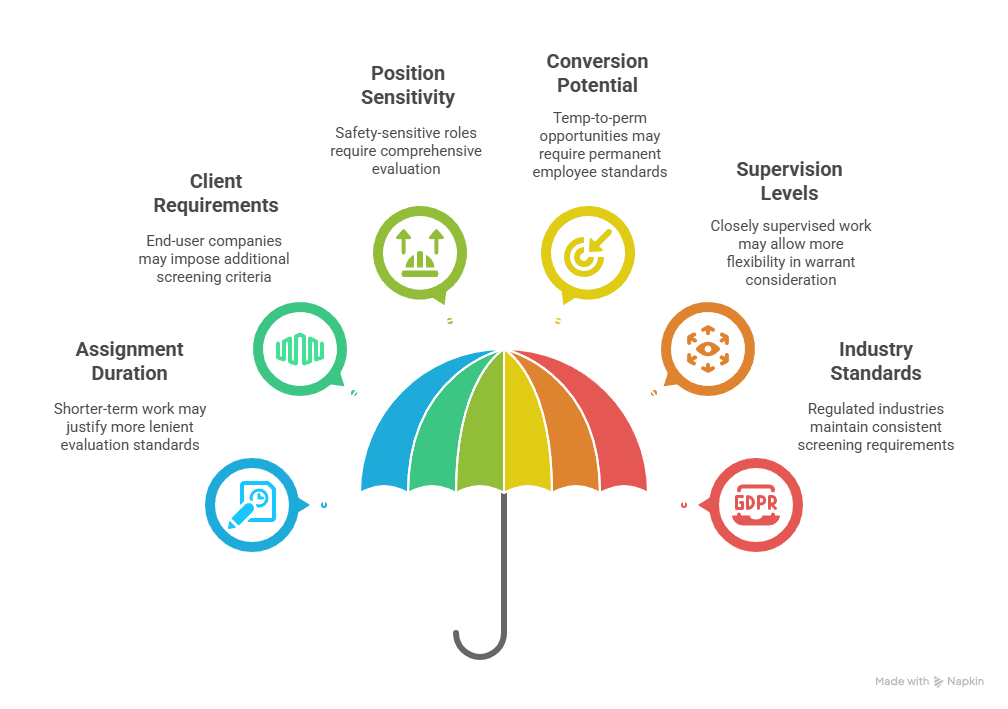 - Client requirements: End-user companies may impose additional screening criteria beyond agency standards