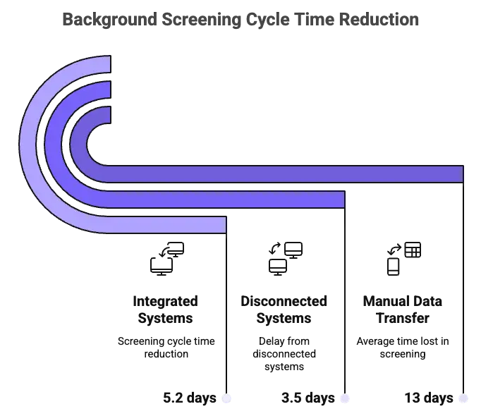 Based on available industry data, platforms with robust screening partner ecosystems (Greenhouse, Workday, iCIMS, Lever) may demonstrate 40-60% faster screening cycle times compared to systems requiring manual data transfer. Specifically, organizations using these platforms report average time-to-clear of 3-5 days versus 7-12 days for manually-integrated systems.