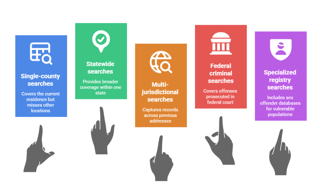 - Single-county searches cover the jurisdiction where the candidate currently resides but miss records from other locations