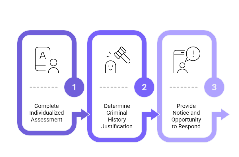Individualized assessment requires employers to evaluate the nature and gravity of the criminal offense, the time elapsed since the offense and completion of sentence, and the nature of the job sought before taking adverse action based on criminal history. Employers must document this analysis and consider any rehabilitation evidence or mitigating information provided by applicants before making final decisions.