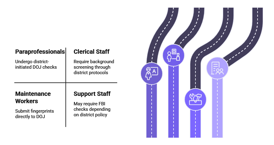 - Credentialed teachers undergo CTC-coordinated screening, while non-credentialed staff may require direct DOJ/FBI submissions through district protocols.