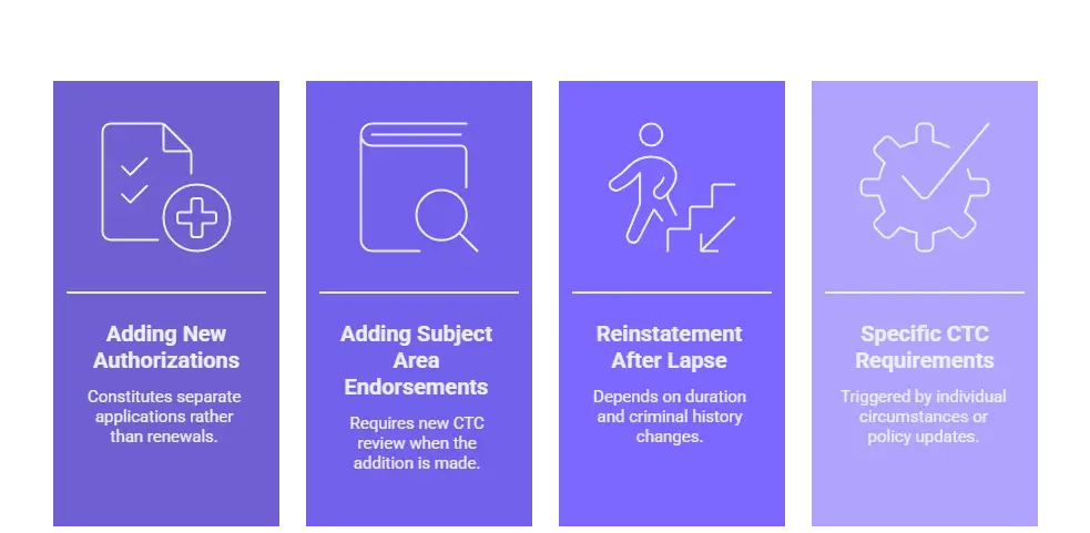 Standard credential renewal typically does not require new background checks. The initial clearance completed during credential application generally remains sufficient for renewal purposes. New fingerprinting becomes necessary when adding credential authorizations that constitute new applications, when credentials have lapsed for extended periods, or when specific circumstances trigger CTC requirements for updated clearance. Verification with the CTC regarding specific renewal situations is recommended.