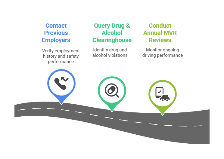 - Previous Employer Verification: Contact all DOT-regulated employers from the past 3 years per 49 CFR § 391.23(d). Verify employment history, safety performance, and reasons for leaving.