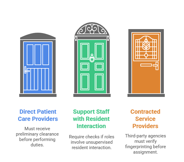 California law distinguishes between employees requiring full background checks before work begins and those eligible for conditional employment during processing. Direct patient care providers—including registered nurses, licensed vocational nurses, certified nursing assistants, and medication technicians—cannot perform duties until receiving preliminary clearance. Support staff such as administrators, social workers, activities coordinators, and maintenance personnel fall under the same requirement if roles involve unsupervised resident interaction.