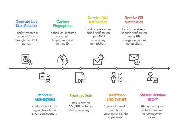 - California nursing home employee screening requires CDPH-approved criminal background clearances through Live Scan fingerprinting before any patient contact begins.