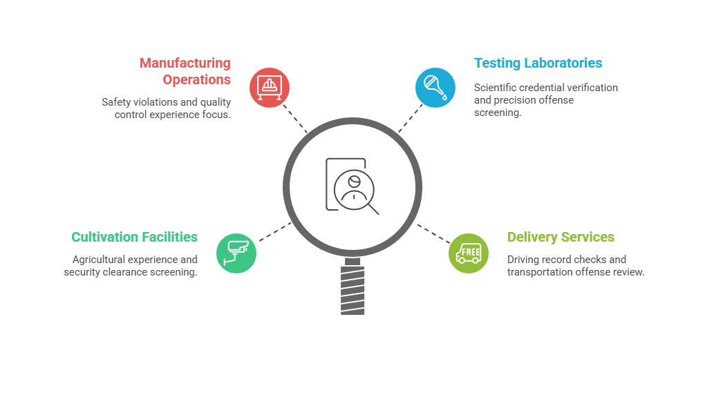 - Cultivation facilities: Enhanced screening for agricultural experience and security clearances
