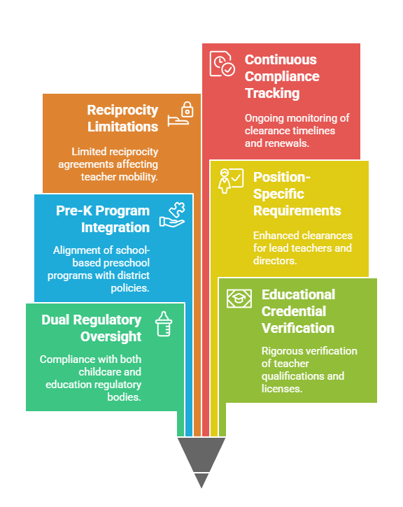 - Educational Credential Verification: Enhanced screening protocols for preschool teachers including verification of degrees and professional teaching licenses