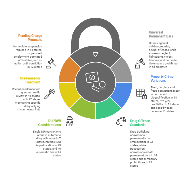 - Disqualifying offenses extend beyond convictions to include pending charges, substantiated child abuse findings, and placement on sex offender registries, though 23 states now offer rehabilitation waiver processes.