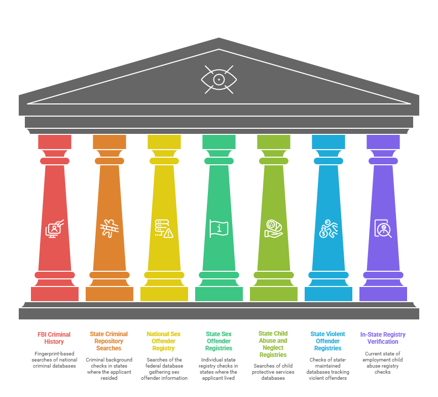 The federal background check comprises seven distinct searches. These searches together provide multiple perspectives on an applicant's history. These layered searches create redundancy that catches records potentially missed by single-source checks. As a result, they significantly strengthen child protection protocols.