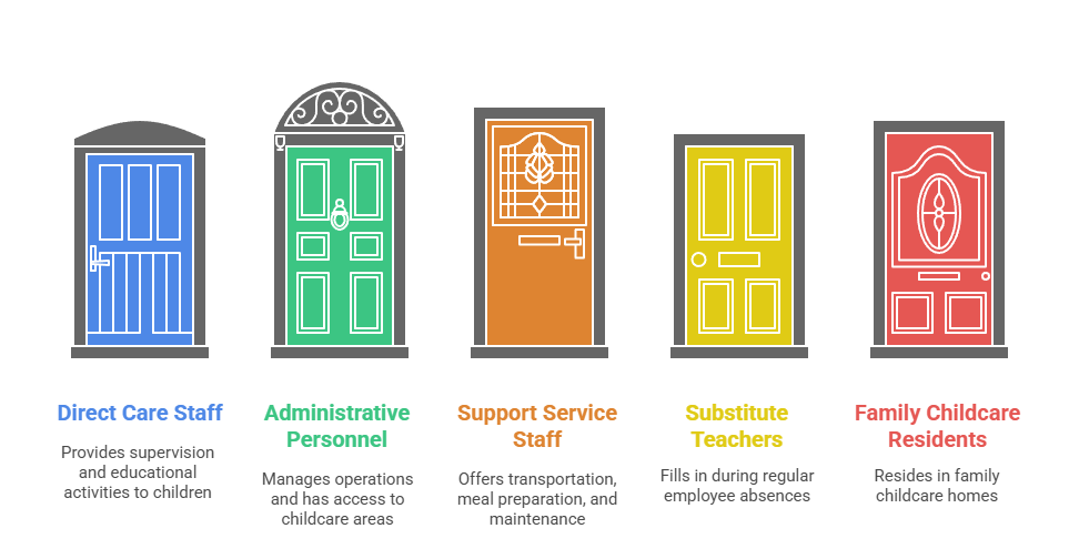 - Support Service Staff: Transportation providers, meal preparation staff working during childcare hours, and maintenance workers with facility access when children are present