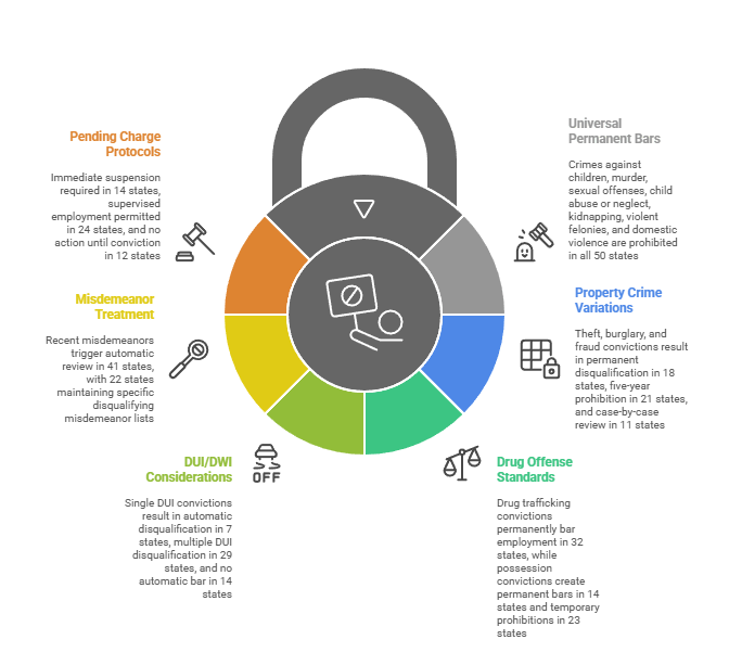 - Disqualifying offenses extend beyond convictions to include pending charges, substantiated child abuse findings, and placement on sex offender registries, though 23 states now offer rehabilitation waiver processes.