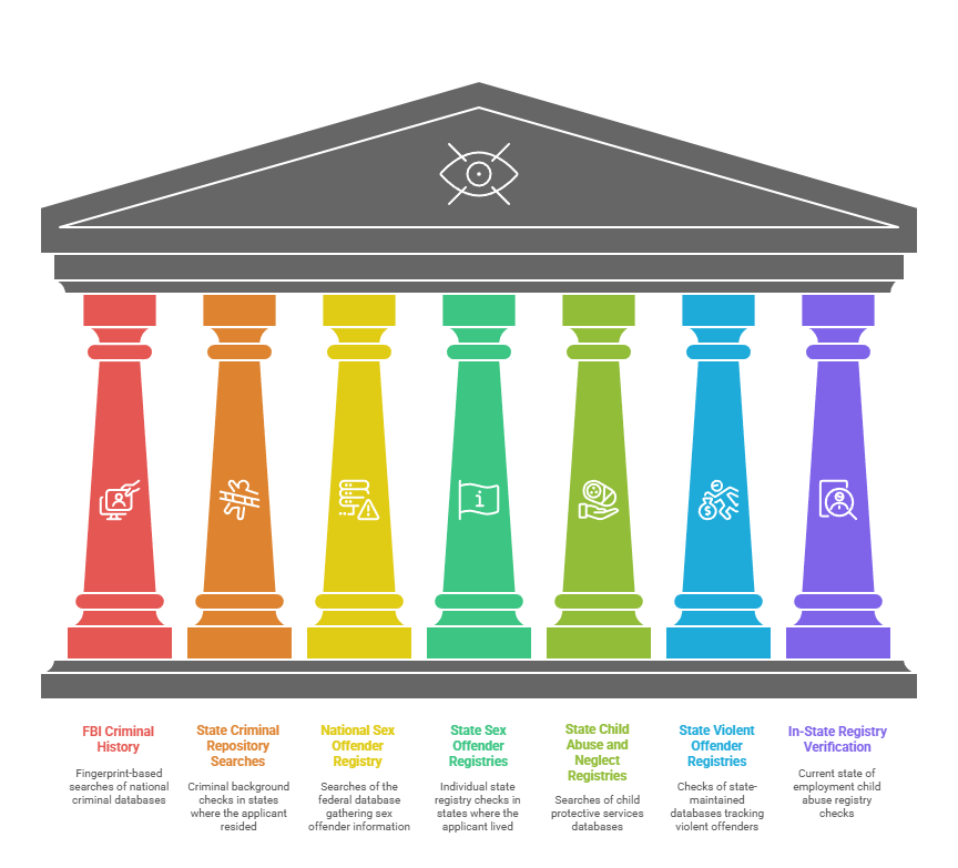 The federal background check comprises seven distinct searches. These searches together provide multiple perspectives on an applicant's history. These layered searches create redundancy that catches records potentially missed by single-source checks. As a result, they significantly strengthen child protection protocols.