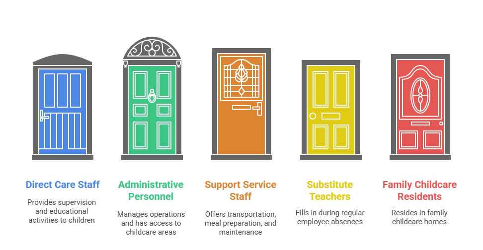 - Support Service Staff: Transportation providers, meal preparation staff working during childcare hours, and maintenance workers with facility access when children are present