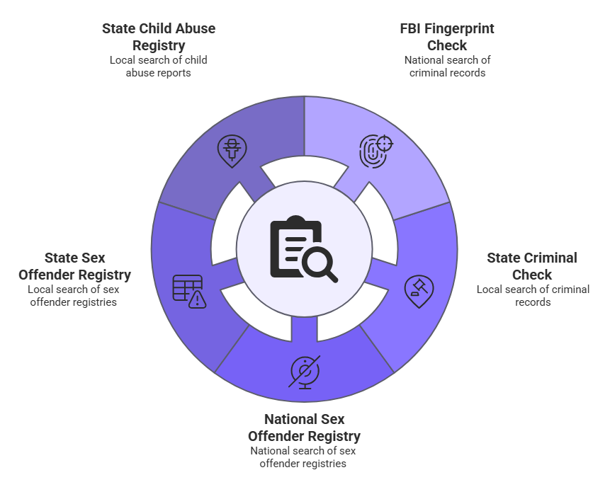 The CCDBG Act mandates the following five searches for all childcare staff members, including prospective employees, before they can work in a child care setting: