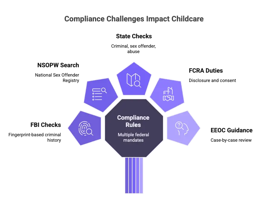 Childcare compliance combines multiple federal mandates, multi-registry checks across state lines, a supervised-start pathway with strict record-keeping, FCRA duties, and a complex state and local legal landscape. All of this exists within a sector defined by high turnover and thin admin capacity.