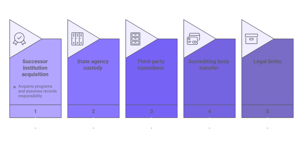 Records typically transfer to state education agencies, successor institutions, or third-party custodians depending on closure circumstances and state requirements. Accreditation agreements often mandate records preservation plans. The specific destination varies by institution, but state higher education departments can usually identify where particular schools' records were transferred.