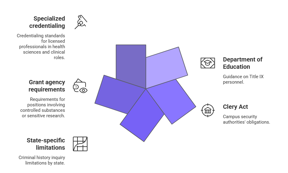 University screening programs must account for multiple regulatory touchpoints. Title IX compliance efforts may require specific screening for employees with student contact or supervisory authority. The Clery Act designates certain employees as campus security authorities, which may influence screening decisions for those roles. Meanwhile, accreditation bodies maintain standards for instructional personnel credentials that inform faculty screening protocols.