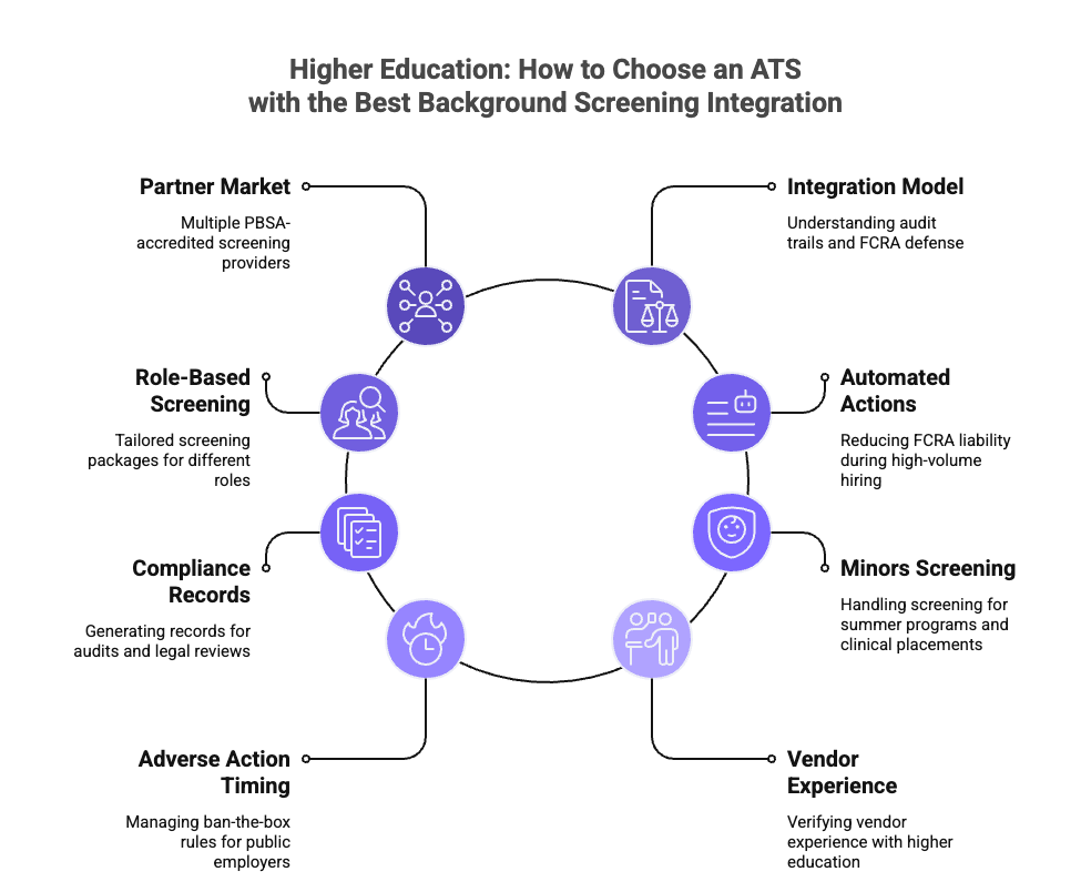 Platforms with deep, native background screening integrations give higher education schools the audit trails, role-based setup, and FCRA workflow steps their compliance programs need. Platforms without them do not. Universities, colleges, community colleges, and trade schools operate under layered screening duties that make ATS integration depth a compliance issue, not a convenience choice.