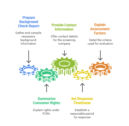 The adverse action process involves multiple stages: pre-adverse action notice, waiting period, final adverse action notice, and record retention. Each stage includes specific timing requirements and content obligations. Colorado's individualized assessment requirement adds additional layers to the federal FCRA framework.