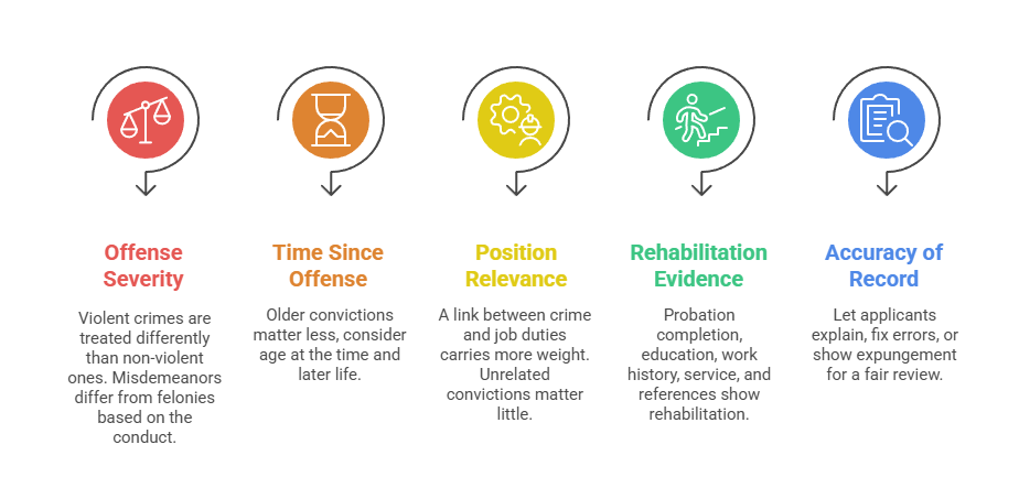 - Nature of position: Direct relationship between criminal conduct and job responsibilities justifies greater weight. Unrelated convictions receive minimal consideration.