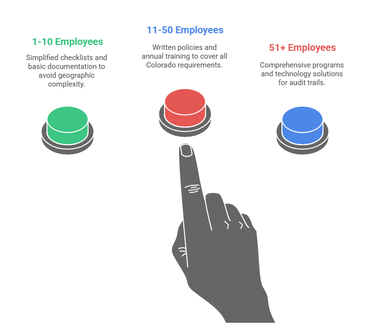 - 11-50 employees: Implement written background check policies covering all Colorado requirements. Conduct annual compliance training for hiring managers. Establish vendor relationships with SLA specifications. Maintain dedicated compliance documentation files. Mid-sized businesses should consider whether multi-location operations require geography-specific procedures or company-wide protective standards.