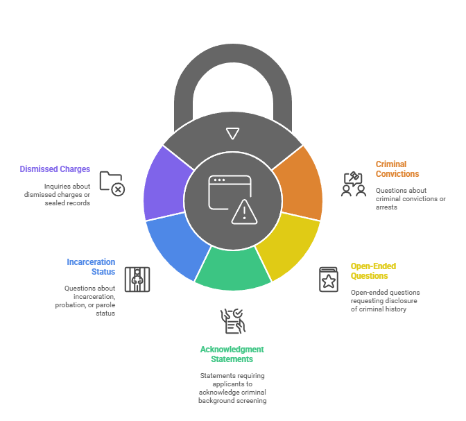 The prohibition's scope extends beyond direct questions. It includes any language that might discourage applicants with criminal histories from applying. Warning statements about background checks or emphasizing "clean record" preferences can create compliance concerns even without explicit questions.