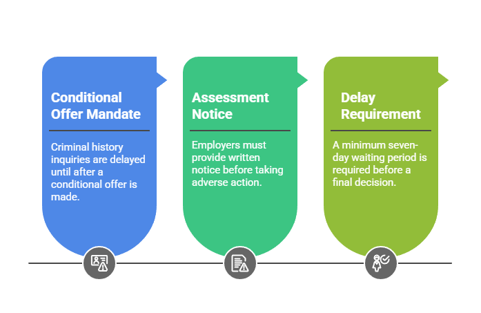 - Conditional offer mandate: Criminal history inquiries must wait until after conditional offer. This eliminates the post-interview option available under state law.