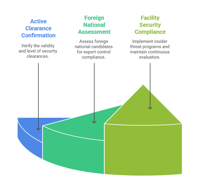 - Active Clearance Confirmation: Background screening must confirm security clearances remain valid. It must verify clearance levels match position requirements.