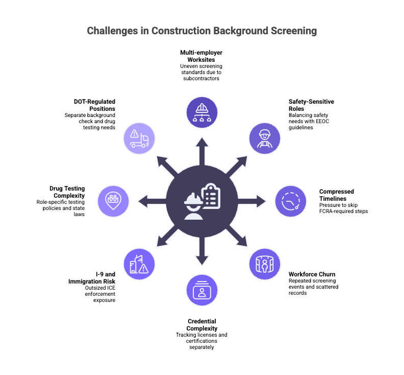 Construction employers face a uniquely dense set of compliance needs. Key factors that make construction background checks more complex than most industries: