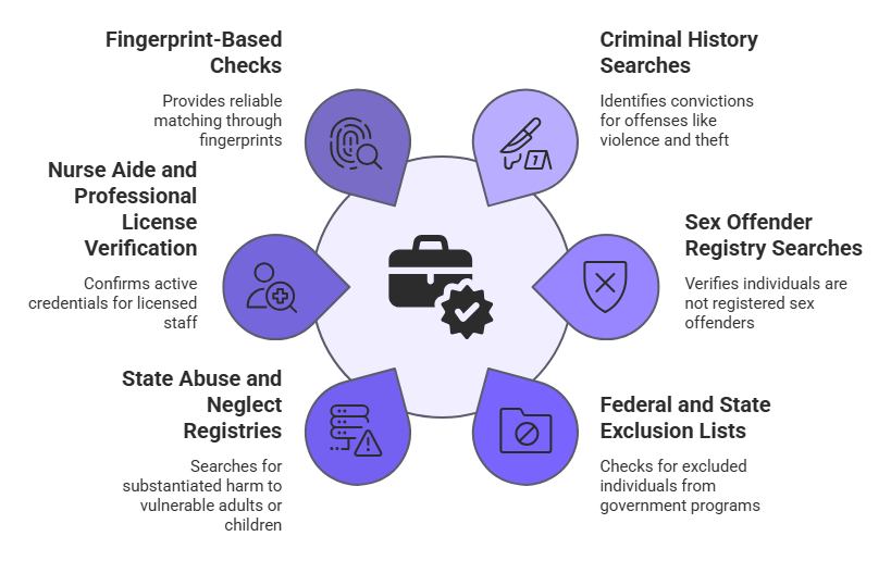 Senior living facilities must conduct a broader range of checks than many other industries due to the vulnerability of the population served and the regulatory requirements governing healthcare workers. The following checks are commonly required or strongly recommended: