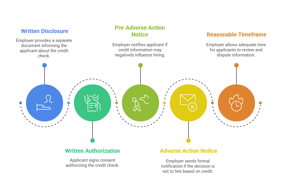 - The Fair Credit Reporting Act requires employers to obtain written consent before conducting credit checks and provide adverse action notices if credit information influences hiring decisions.