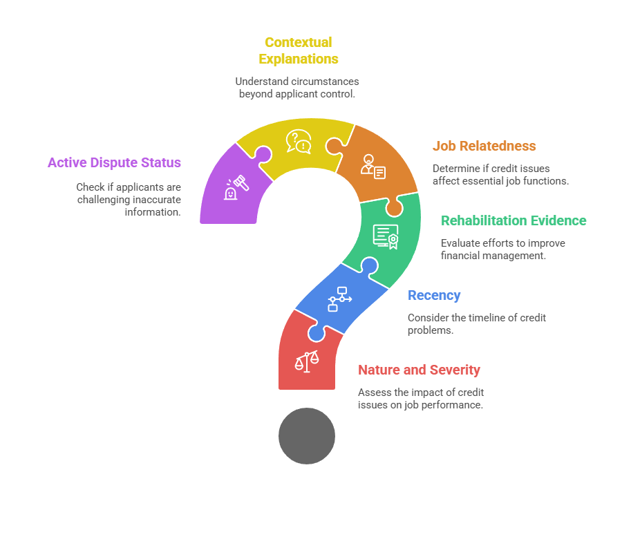 - Job Relatedness: Connection between specific credit issues and essential job functions.