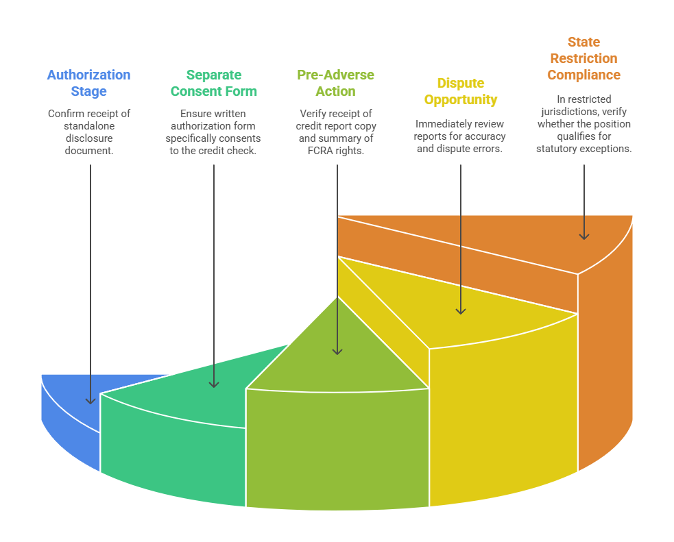 - Authorization Stage: Confirm receipt of standalone disclosure document clearly stating a credit report may be obtained, separate from job application materials.