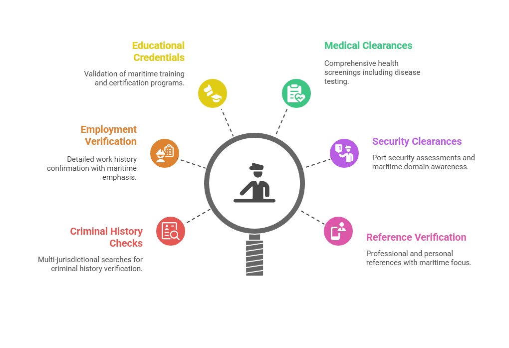 - Maritime background checks involve multi-layered screening including criminal history, employment verification, medical clearances, and specialized maritime certifications required by international law.