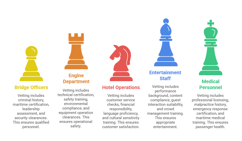 - Medical Personnel: Professional licensing verification, malpractice history review, emergency response certification, and specialized maritime medical training