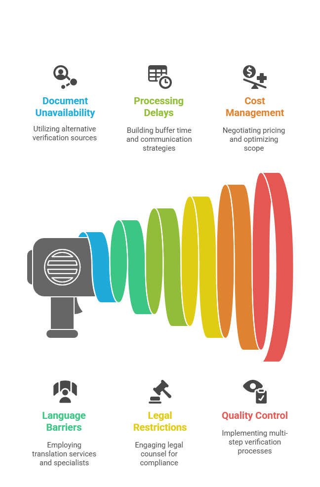 - Language barriers: Partner with certified translation services and maintain relationships with multilingual verification specialists. Digital translation tools have improved significantly but still require human oversight for legal documents.