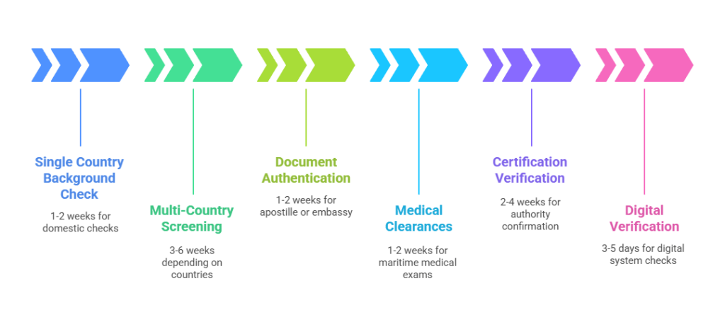 - Processing timelines typically range from 2-8 weeks depending on the number of countries involved and complexity of verification requirements for international maritime positions.