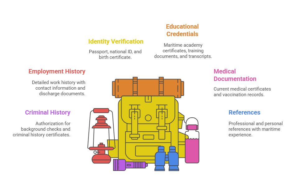 - Educational credentials: Maritime academy certificates, training completion documents, and degree transcripts