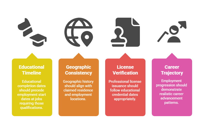 Comprehensive verification queries multiple authoritative databases simultaneously to identify inconsistencies that single-source checks miss. The systems compare applicant-provided information against educational institution records, employment verification databases, professional licensing authorities, and public records repositories.