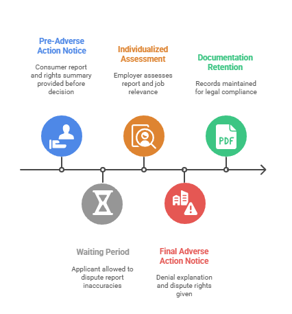 Final adverse action notices must be sent to applicants if the institution proceeds with employment denial after the waiting period and individualized assessment. The complete adverse action process includes the following stages: